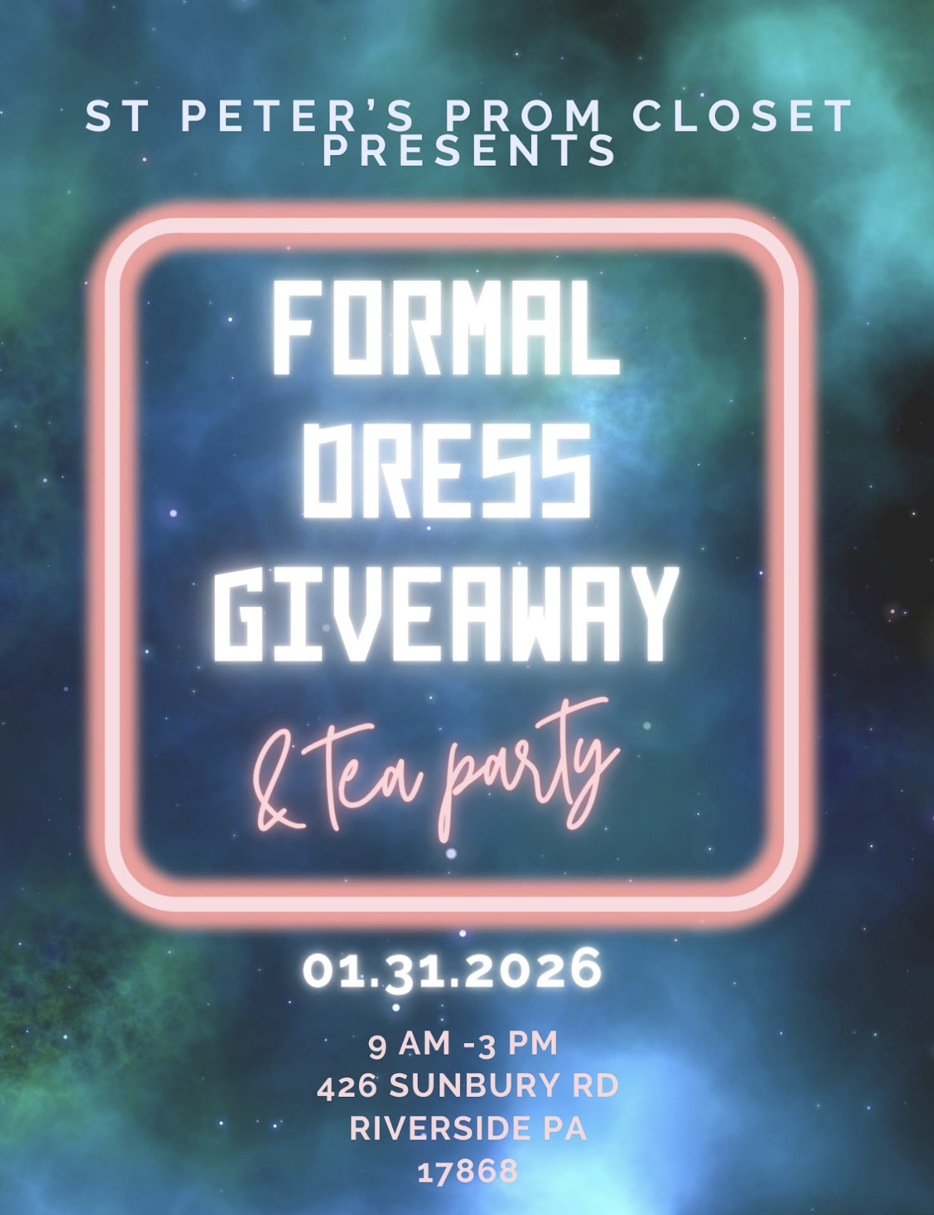 On Saturday, January 31, 2026 join us for a tea party and dress selection event.  We wil have all styles of formal dresses to choose from.